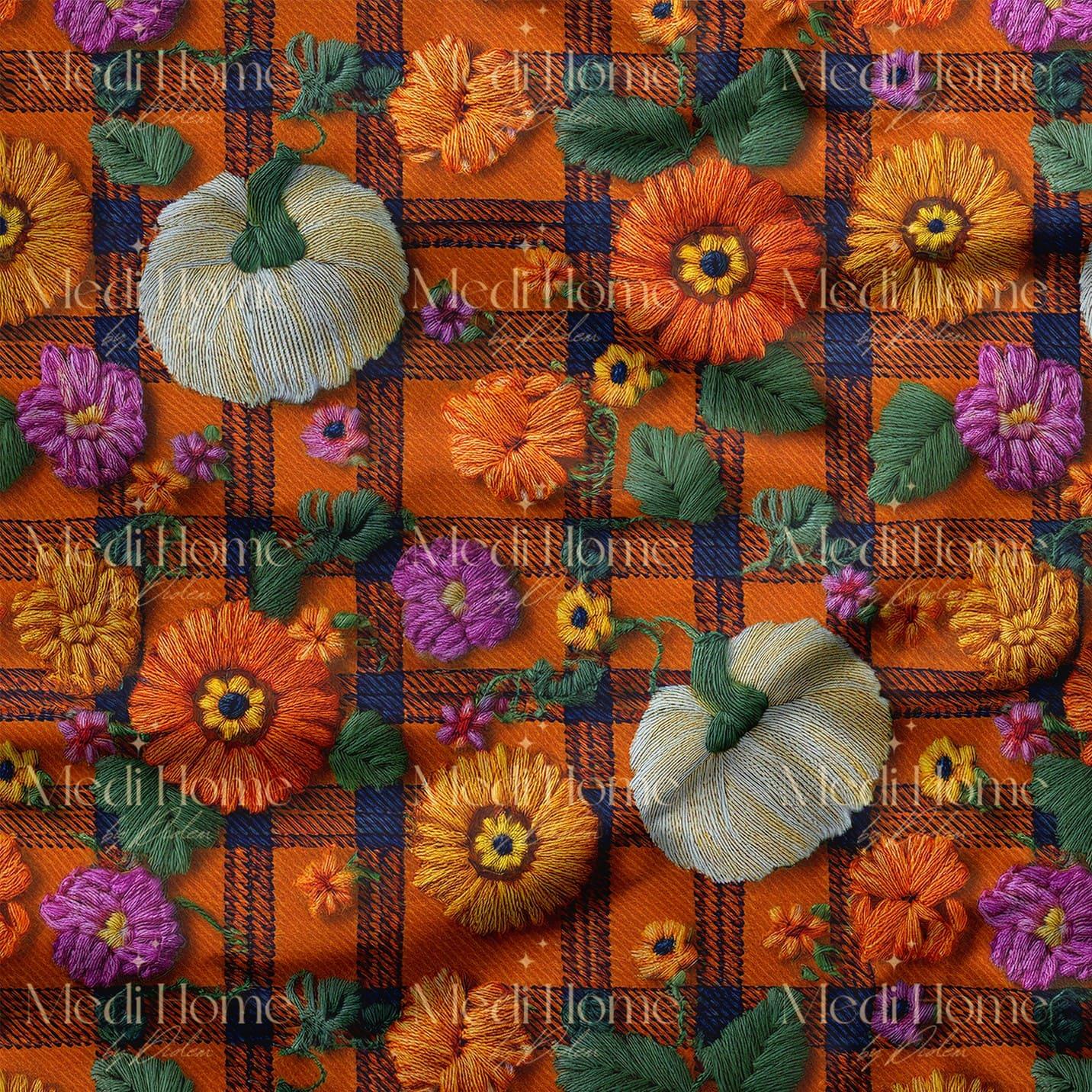Turuncu Ekose Bahçesindeki Balkabağı ve Çiçek Rüyası Dijital Baskılı Kumaş (Embroidered Pumpkins Plaids-22)