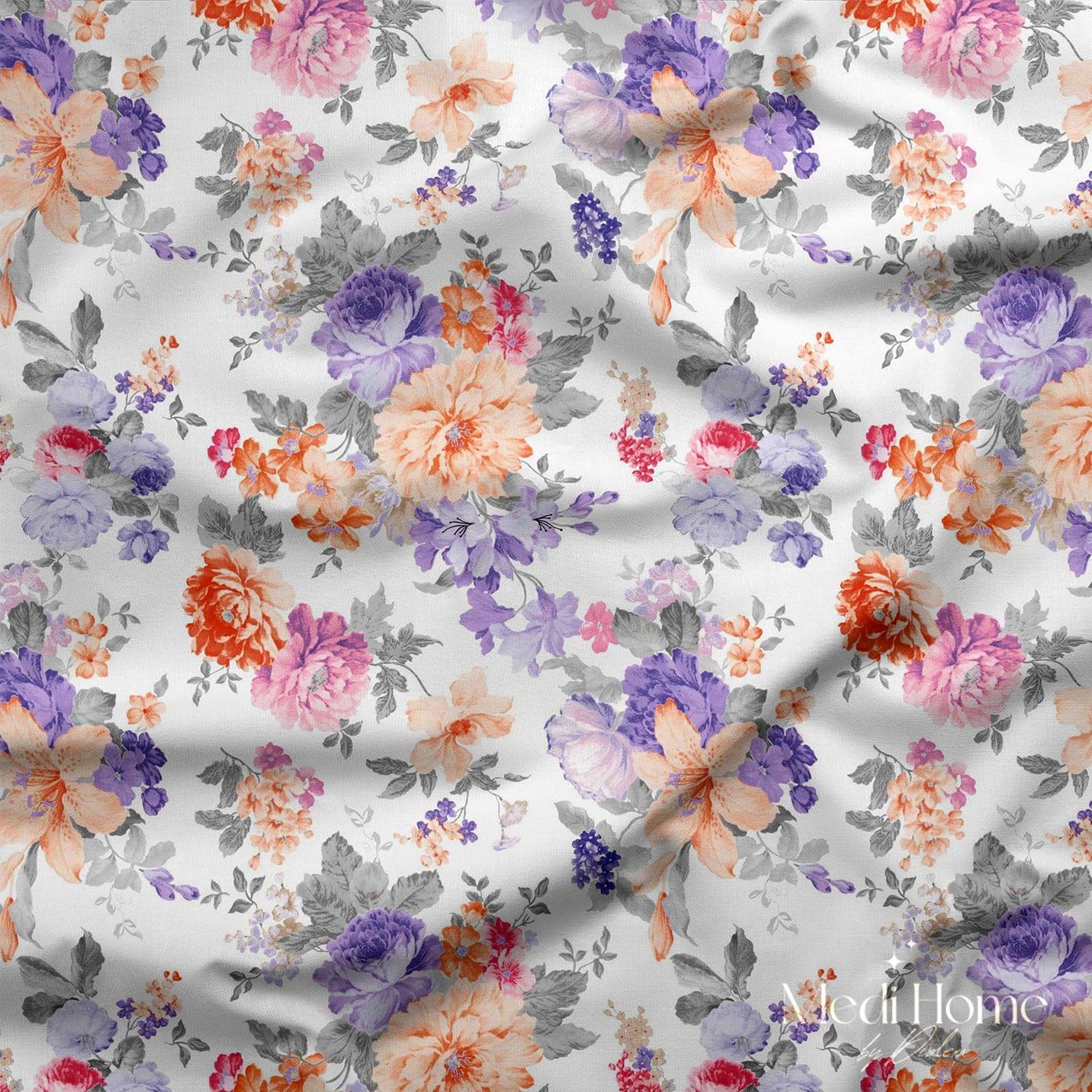Bu desen, renklerin melodik bir uyumla dans ettiği bir çiçek senfonisini andırıyor. Açık kırık beyaz zemine serpiştirilmiş turuncu, lavanta, mürdüm, mercan ve yumuşak mor tonlarındaki çiçekler; klasik, romantik ve zarif bir atmosfer yaratıyor. Gül, ortanca, şakayık ve leylak benzeri detaylı çiçek formasyonları; doğadan ilham alan bir sanat eseri gibi karşımıza çıkıyor.
