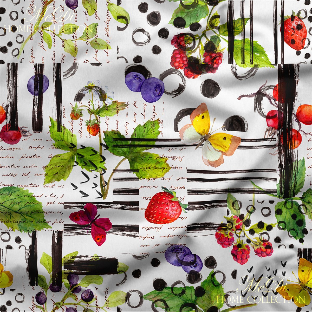Bu desen sanki bir yaz pikniği masasının güncesi gibi. Canlı kırmızı çilekler, mor erikler, ahududular, fırça darbeleriyle modernleşmiş siyah detaylar, nokta ve çizgilerle tamamlanan enerjik bir kompozisyon. Aralara serpiştirilmiş yazı parçaları, kelebekler ve meyve dallarıyla hem estetik hem de eğlenceli bir görünüm sunuyor.