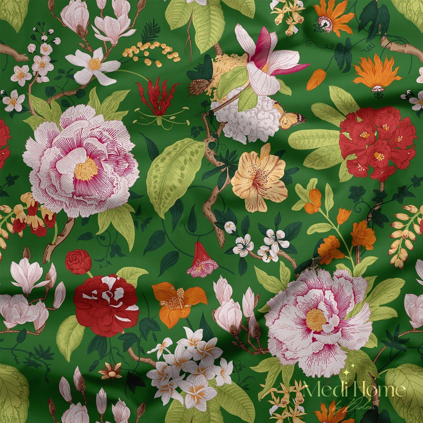 Canlı koyu yeşil bir zemin üzerinde çiçeklerin adeta bir şiir gibi açtığı bu desen, doğanın zarafetini evlere taşıyor. Kırmızı güller, beyaz ve pembe şakayıklar, portakal rengi orkideler ve tropikal çiçeklerle bezeli desen, hem geleneksel hem de çağdaş bir estetiği bir araya getiriyor.