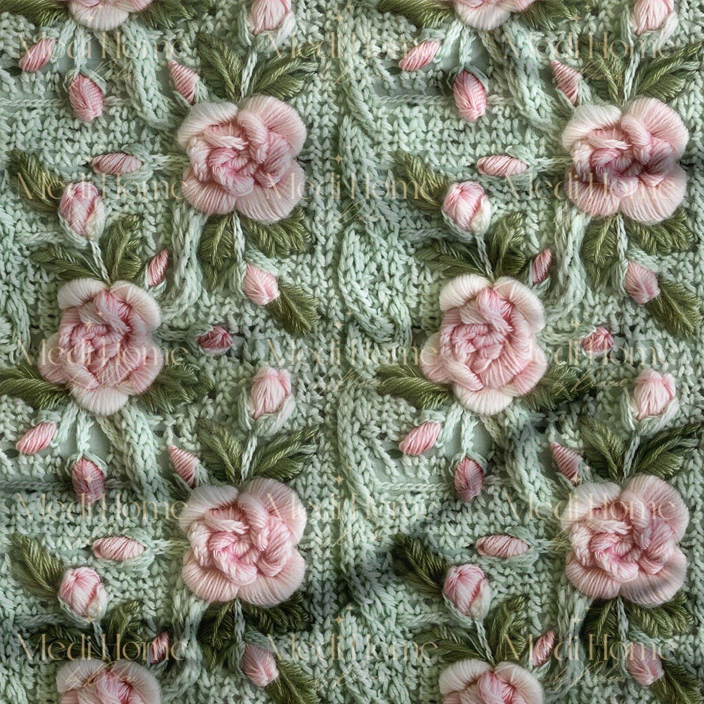 Yeşil Örgüde Pudra Gül Rüyası Dijital Baskılı Kumaş (knitflor 13)