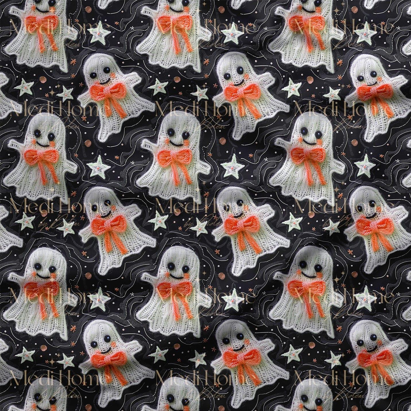Yıldızlı Gecede Turuncu Fiyonklu Tatlı Hayaletler Dijital Baskılı Kumaş