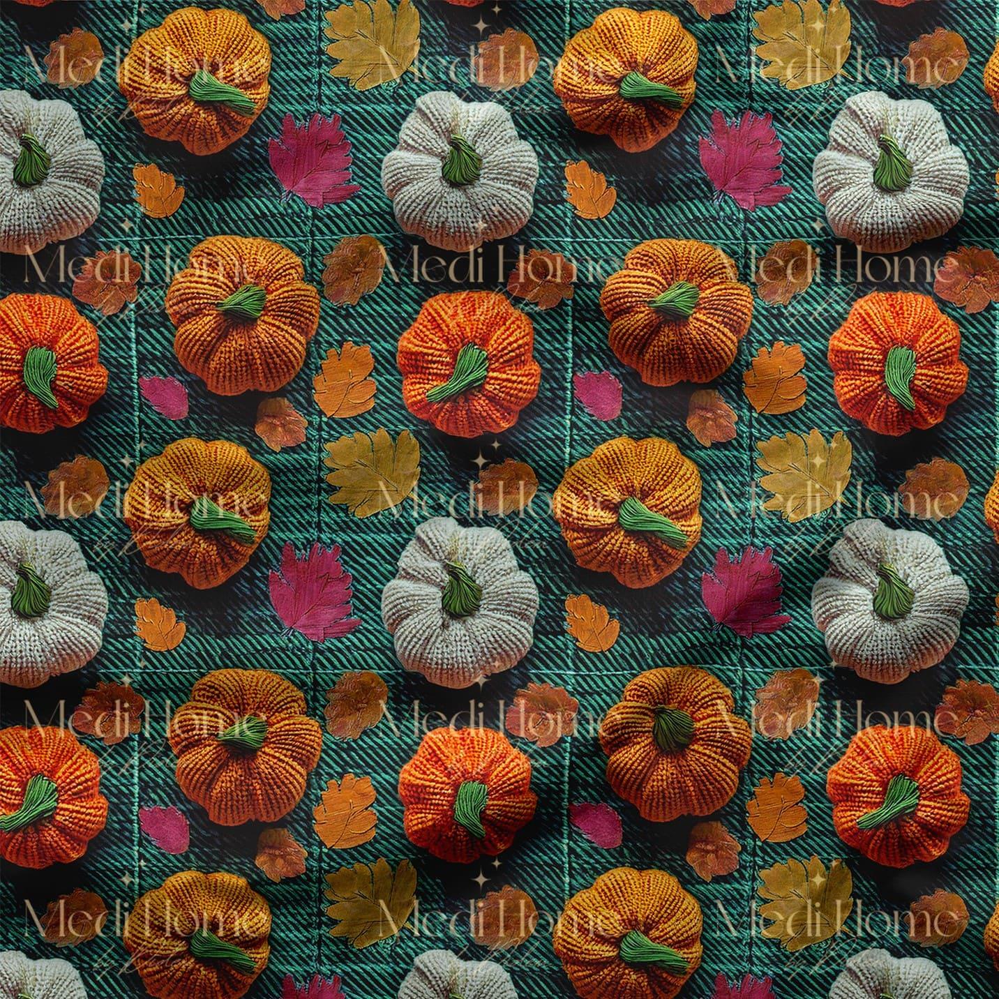 Zümrüt Zeminde Sonbahar Balkabakları Dijital Baskılı Kumaş (Embroidered Pumpkins Plaids-15)